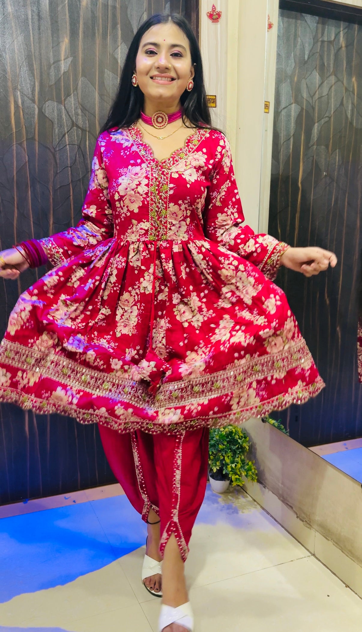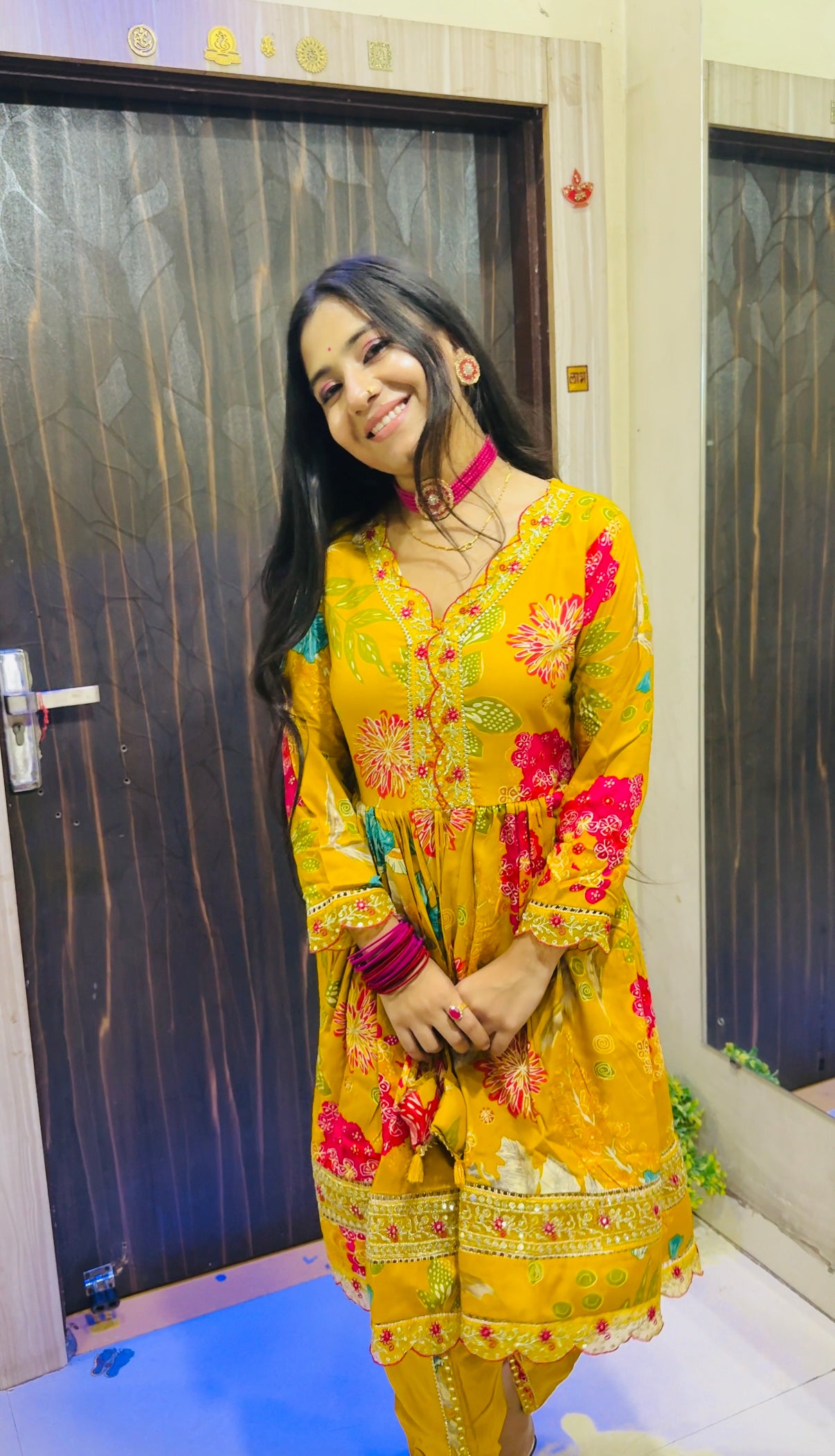 Brighten your ethnic wardrobe with this vibrant mustard floral printed kurta set. Crafted from soft and breathable cotton fabric, it features intricate floral prints in shades of pink, green, and blue, detailed lacework on the neckline and hem, and a comfortable silhouette perfect for festive and casual occasions. Pair it with matching bangles and earrings for a chic traditional look.