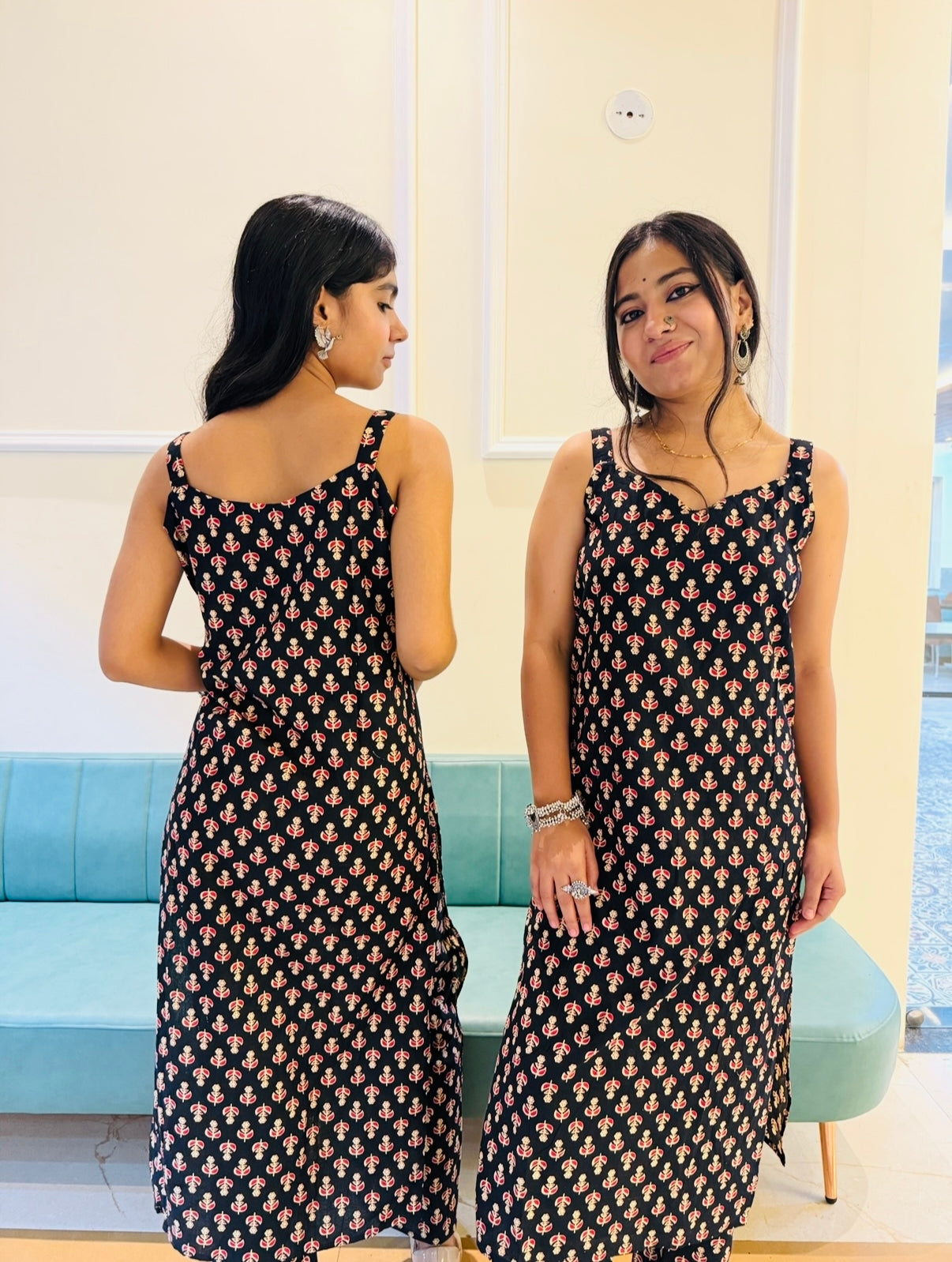 Handcrafted Cotton Kurta Set β Black Block Print Strappy Kurta with Matching Pants