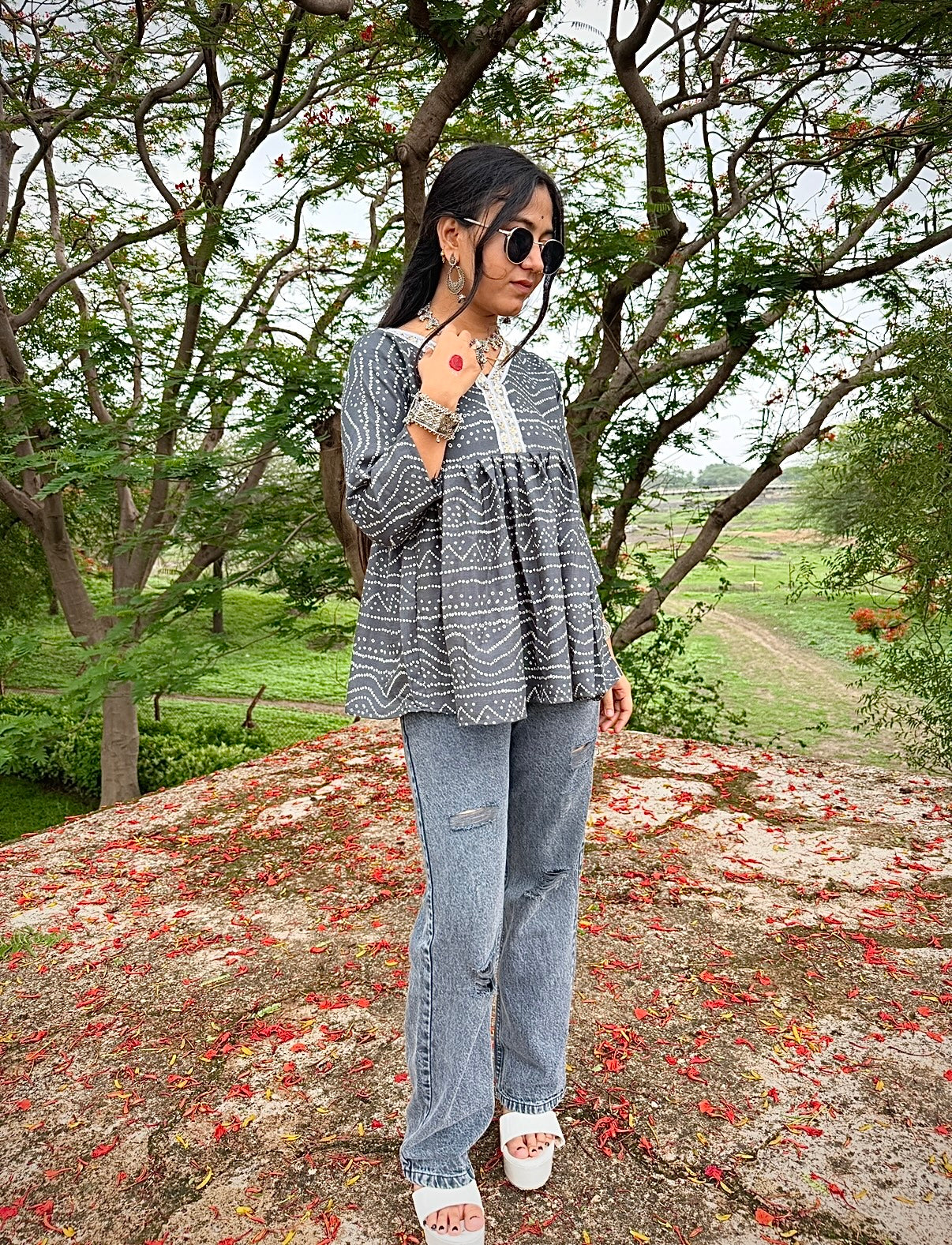 Refresh your casual wardrobe with this beautiful Bandhani print peplum top. Crafted from lightweight cotton, it features a flattering V-neckline with delicate mirror work detailing that adds a touch of sparkle. The relaxed fit and gathered waist create a chic silhouette perfect for pairing with jeans or palazzos. Ideal for casual outings, brunch dates, or daily wear, this top brings effortless style and comfort together.